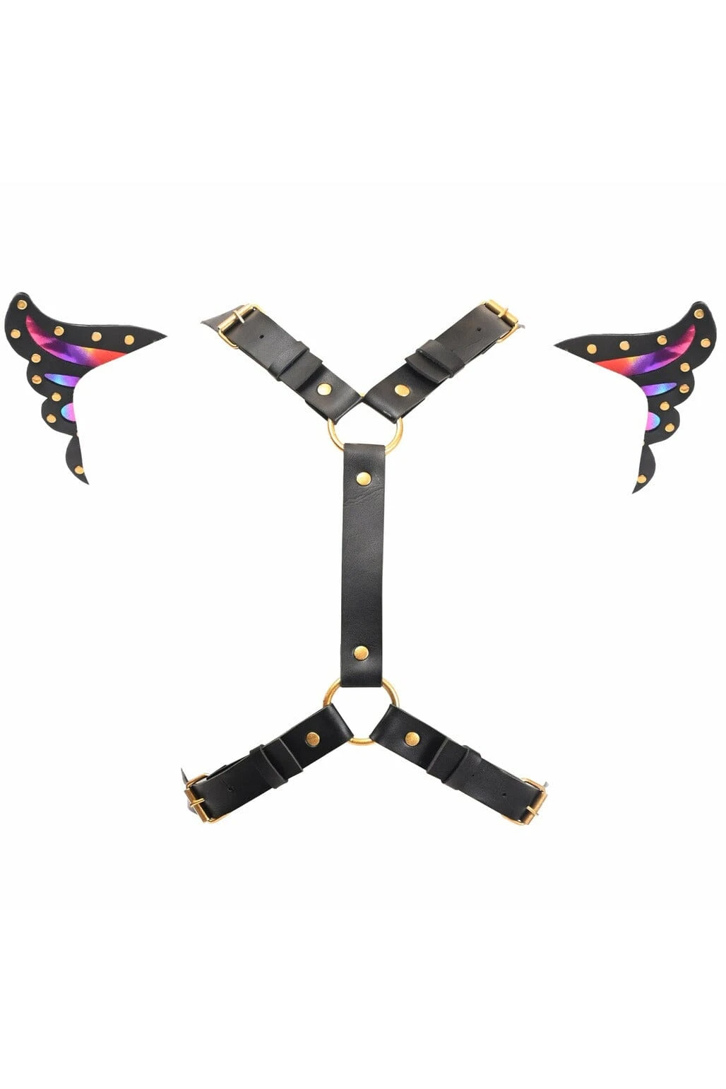 Black Faux Leather & Rainbow Holo Butterfly Wing Harness