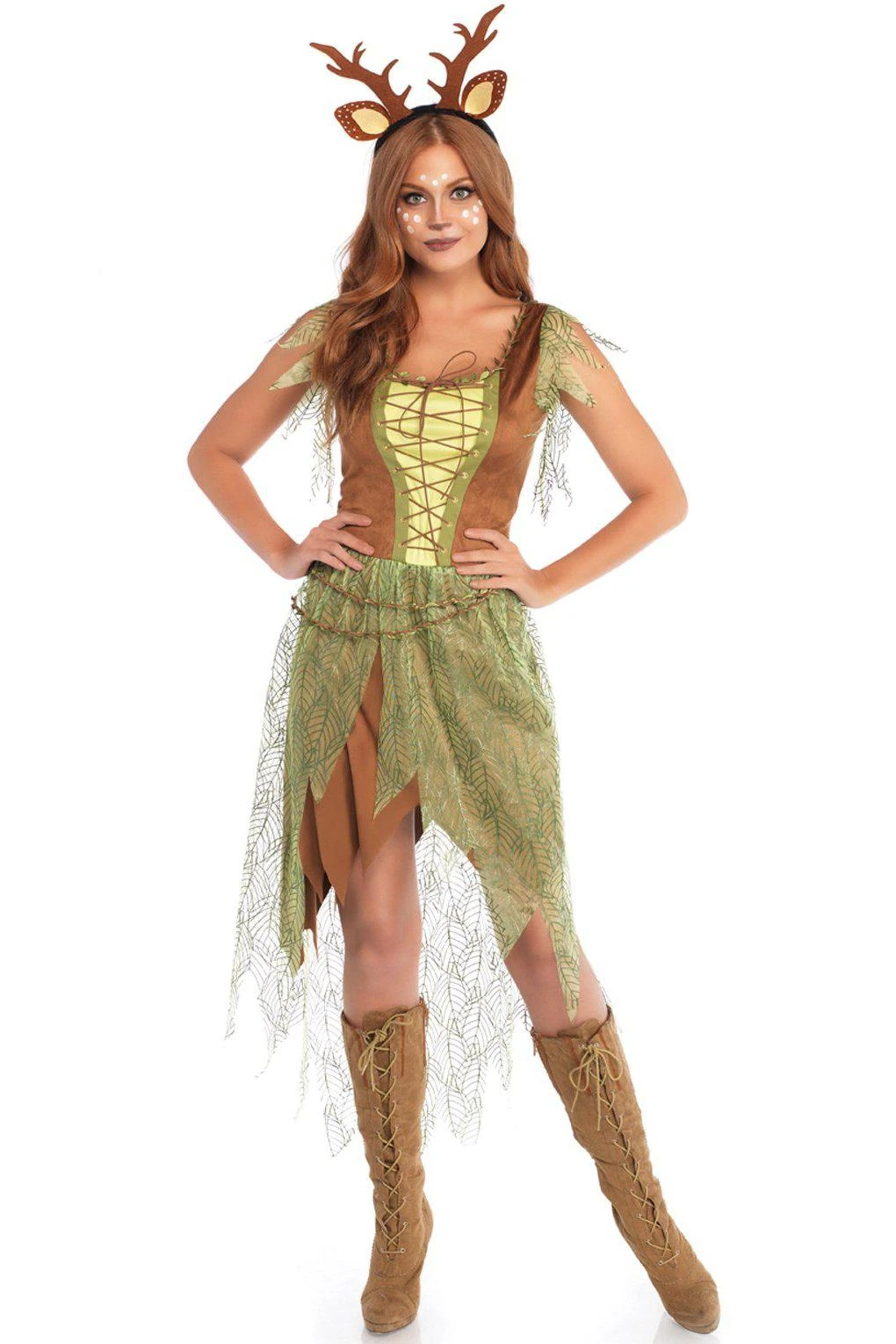 Leg Avenue 2 PC Woodland Fawn, includes dress with lace up bodice and sheer leaf skirt, attached vine belt, and matching antler headband