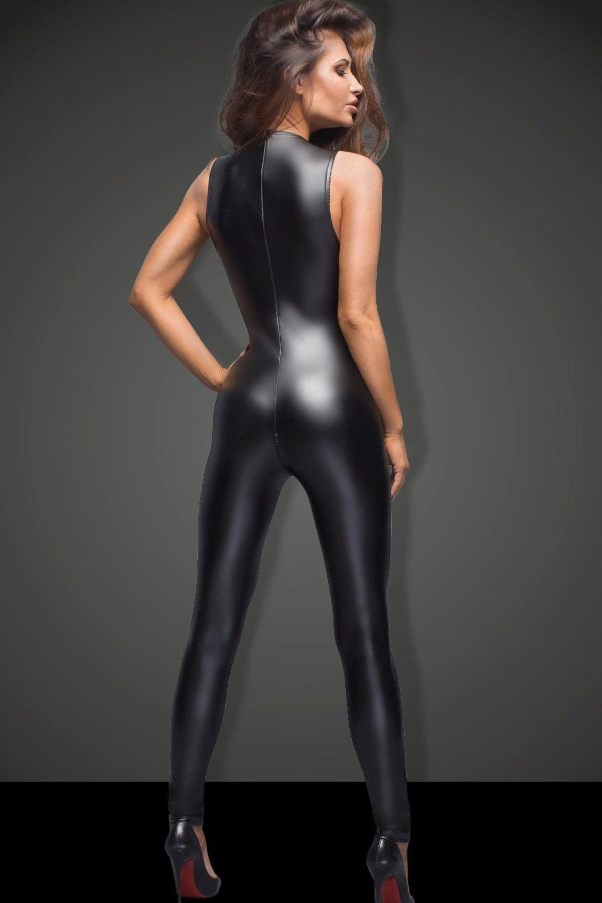 Exclusive Powerwetlook sleeveless overall with 2-way zipper in the crotch and additional zipper on the back. Terrific deep cleavage finished with embroidered lace.