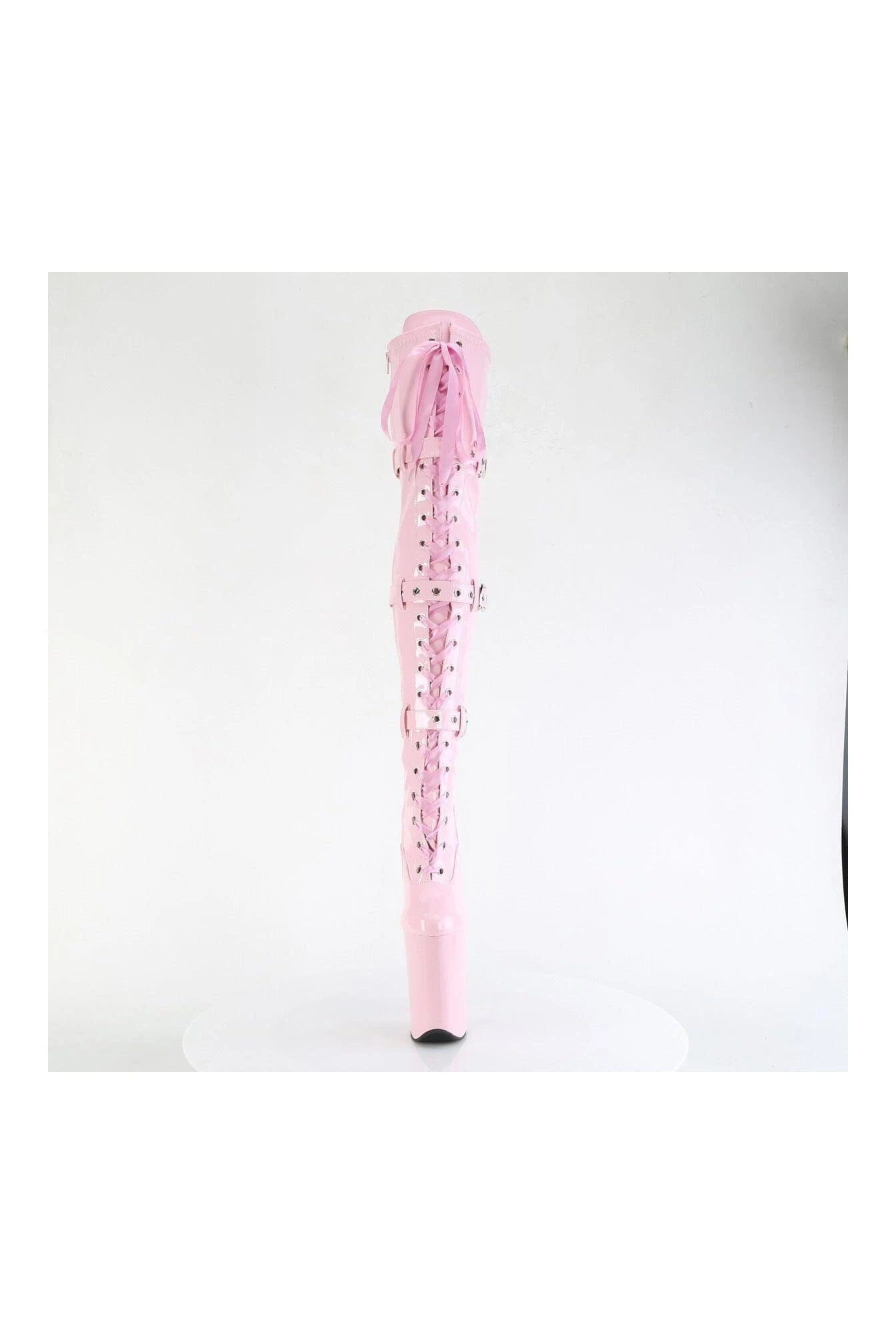 9″ Heel, 5 1/4″ Platform Buckled Lace Up Thigh Boot, Side Zipper