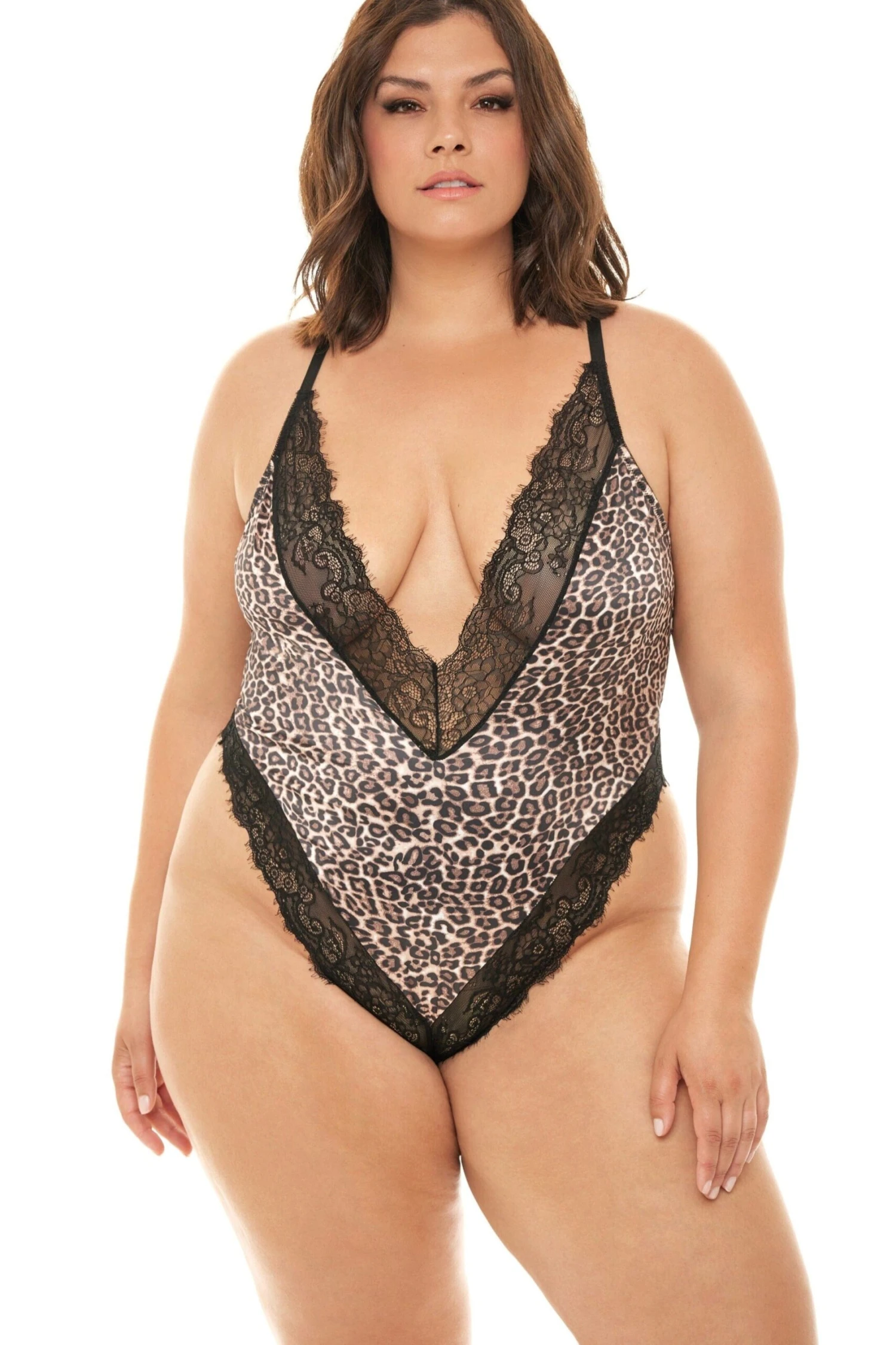 Leopard Print Satin Teddy With Plunging Neckline And Eyelash Lace Finishes