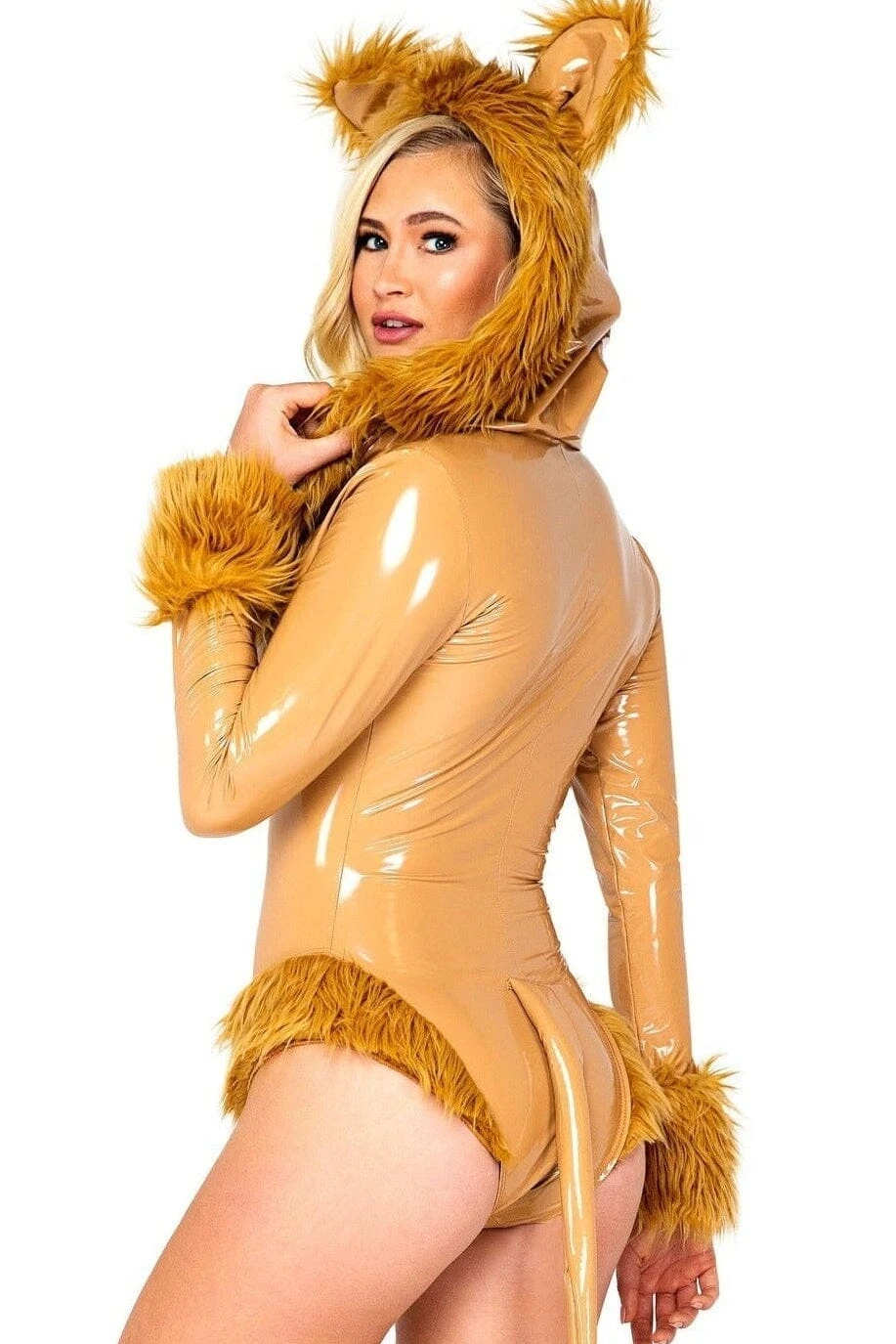1pc Roma Queen of the Jungle costumer nude vinyl bodysuit with long sleeved fur wrists, hips and Lion eared hoodie with a fur tail. Has a deep V neck and front zipper.